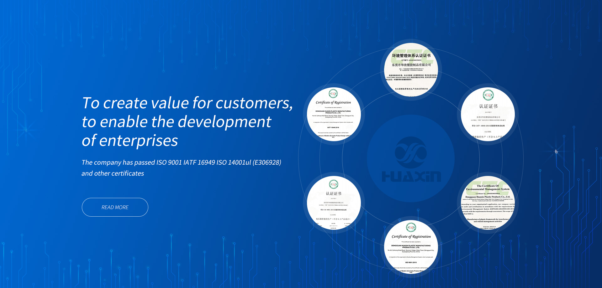 Dongguan Huaxin (formerly Huajing) Plastic Products Co., Ltd. was established in Dongguan, Guangdong in December 2003, with a factory area of 6000 square meters. Hunan Chenzhou Huajing Plastic Products Co., Ltd. was established in Chenzhou, Hunan in December 2011, with a factory area of 3000 square meters. Our company specializes in the production of electric wood, plastic BOBBIN, SMD, automotive electronics, and precision mold development.